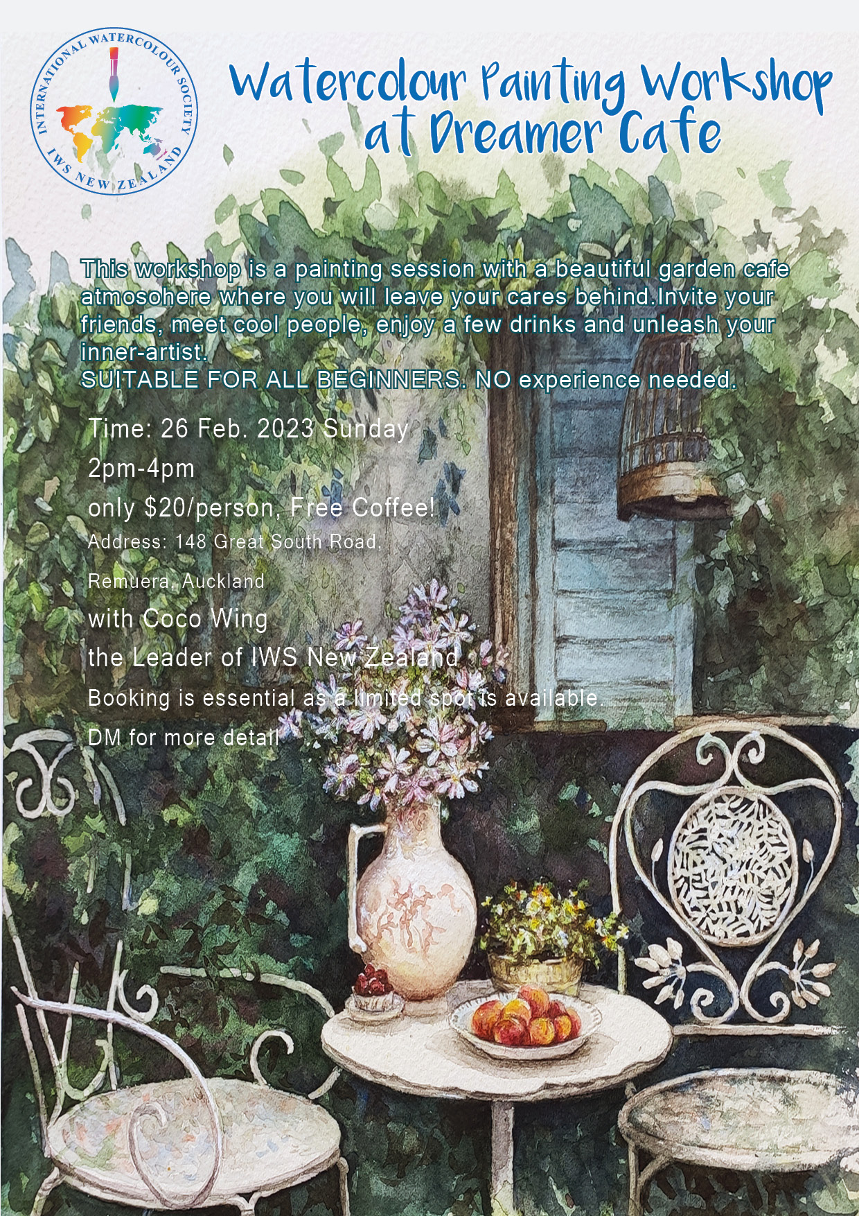 View More 26 February Watercolour Painting Workshop at DreamerCafe 148 Great South Road, Remuera, Auckland, Auckland 10051 New Zealand 2:00 pm - 4:00 pm